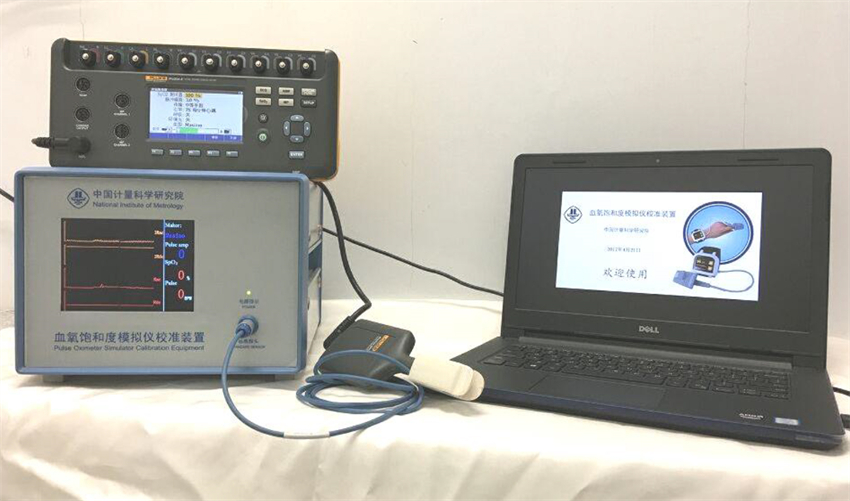 上圖左部下方為“血氧飽和度模擬儀校準(zhǔn)裝置”,校準(zhǔn)裝置上方為被測(cè)的 Prosime8 模擬儀,校準(zhǔn)裝置右方為電腦和軟件。