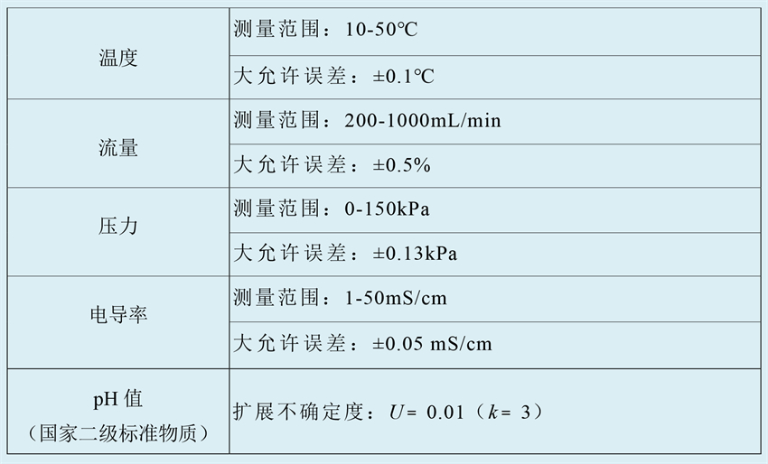 本校準(zhǔn)裝置通過設(shè)計模擬血液透析裝置檢測儀實際工作狀態(tài)的液體循環(huán)回路,并在回路中整合用于校準(zhǔn)血液透析裝置檢測儀溫度、流量、壓力、電導(dǎo)率和 pH 值參數(shù)的標(biāo)準(zhǔn)校準(zhǔn)設(shè)備及國家二級標(biāo)準(zhǔn)物質(zhì),實現(xiàn)了對血液透析裝置檢測儀的溫度、流量、壓力、電導(dǎo)率、pH 值等多參數(shù)一體化校準(zhǔn)。