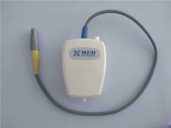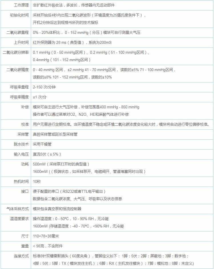 該模塊為中國微流外掛式ETCO2模塊,外觀和尺寸接近美國偉康公司的外掛CO2模塊,通訊協議則與偉康外掛模塊兼容。該模塊氣體采樣流量為50ml/min,與國際流行的微流CO2模塊相同。該模塊具備大氣壓力自動補償功能,因此無需依靠醫生手工輸入大氣壓數值即可保證CO2波形及ETCO2數值的準確度。