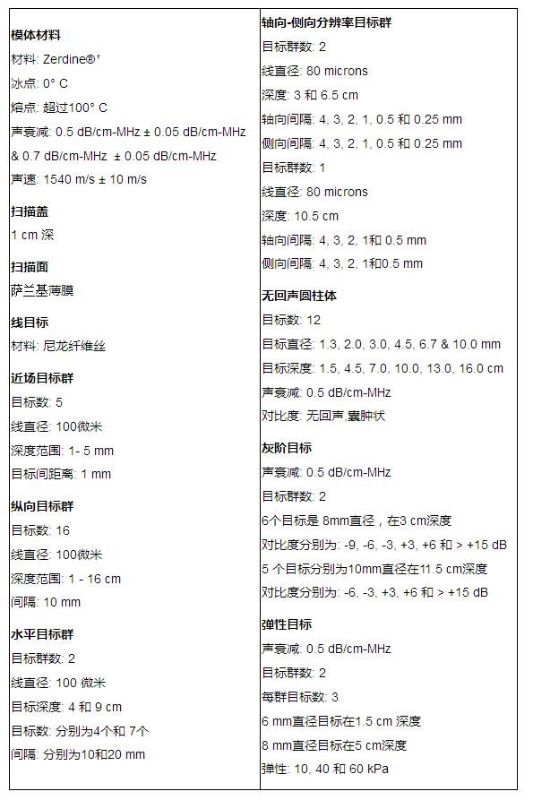 CIRS公司生產的040GSE型多用途/多組織超聲模體包含了9種性能測試,例如灰階目標、無回聲目標和彈性目標。該模體超越了ACR組織對于超聲檢測的要求,令其成為當今市面上既可滿足當今也可滿足未來超聲質量檢測要求的模體。 背景凝膠采用獨特的雙重衰減設計,令得該模體可以評估的探頭頻率覆蓋了2MHz-15MHz范圍,模體采用了可拆卸的存水槽設計,可以評估各種各樣大小的超聲探頭,包括線陣探頭、凸面探頭和腔內探頭等。